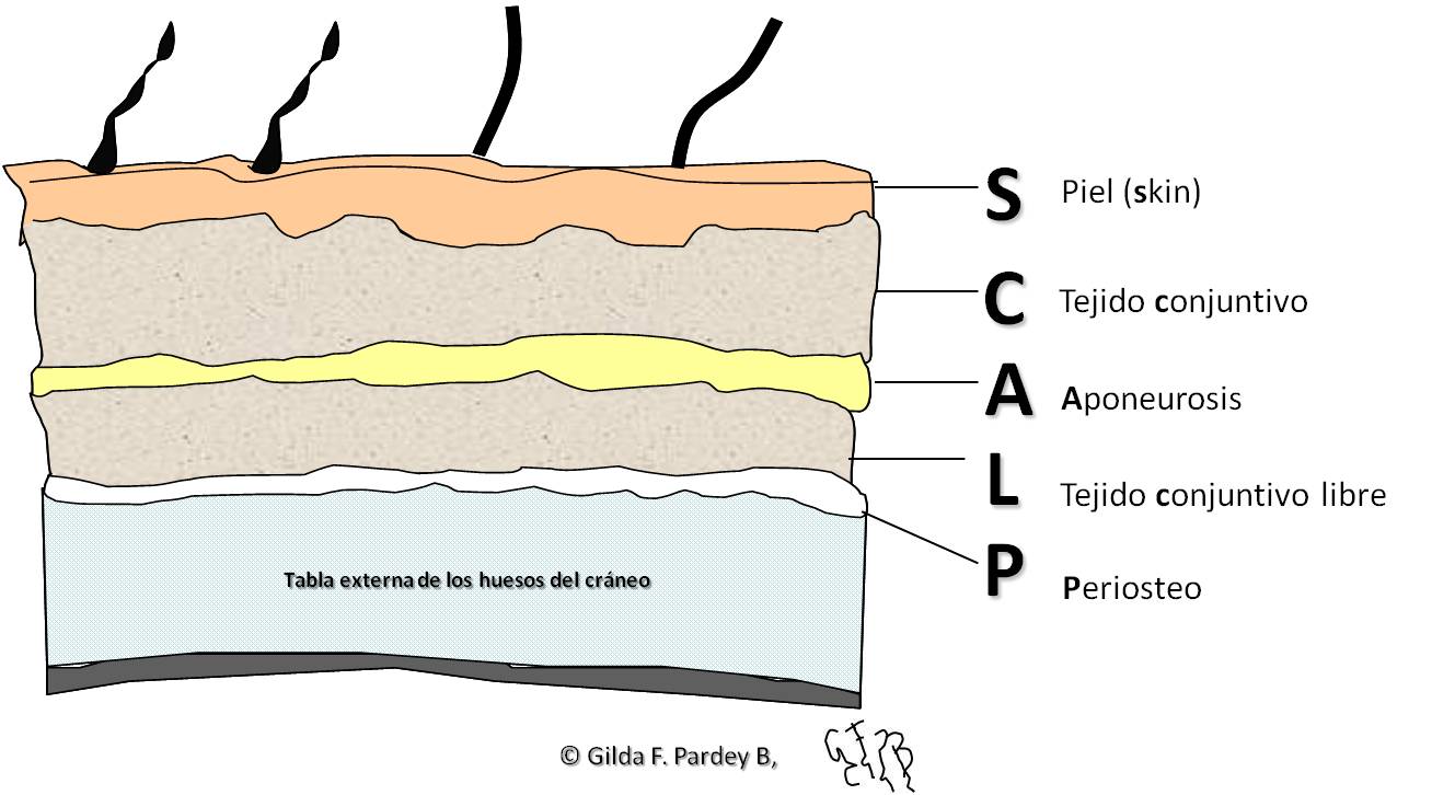 Le scalp est constitué de cinq couches qui lui donnent le nom « SCALP » en anglais: a) Peau (skin = S), b) Tissu Conjonctif (C), c) Aponévrose (A), d) Tissu conjonctif libre (L), e) Péricrâne (P). Voir Figure 1.